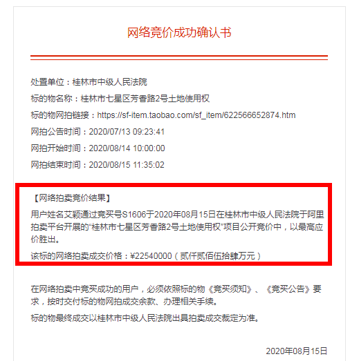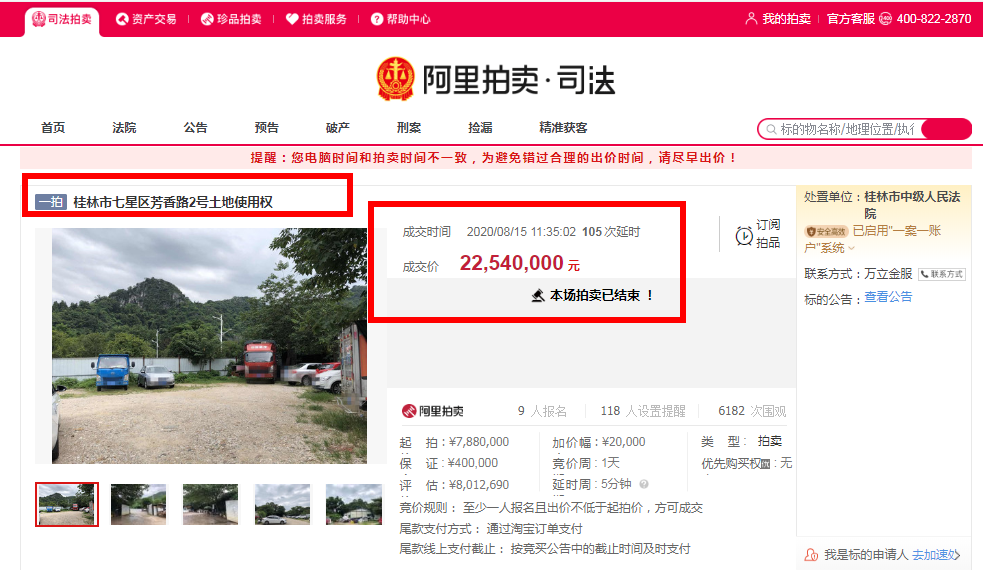 8月15日,桂林市中级人民法院在淘宝司法拍卖将桂林市七星区芳香路2号土地使用权拍卖出让,显示有6182人围观。