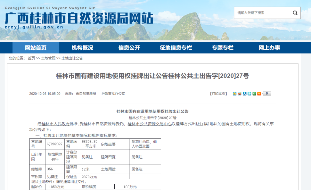 12月8日,桂林市自然资源局发布国有建设用地使用权挂牌出让公告《桂林公共土出告字[2020]27号》,以挂牌方式出让1(幅)地块的国有土地使用权。