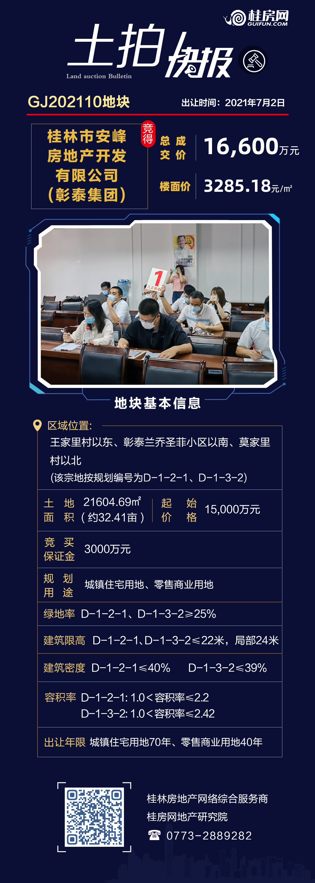 | 2.42 | 21604.69平方米 | 3285.18元/㎡ | 16600.00万元 | 桂林市安峰房地产开发有限公司(彰泰集团) |