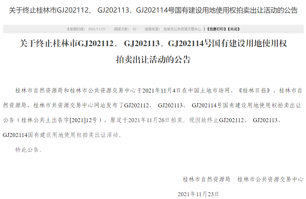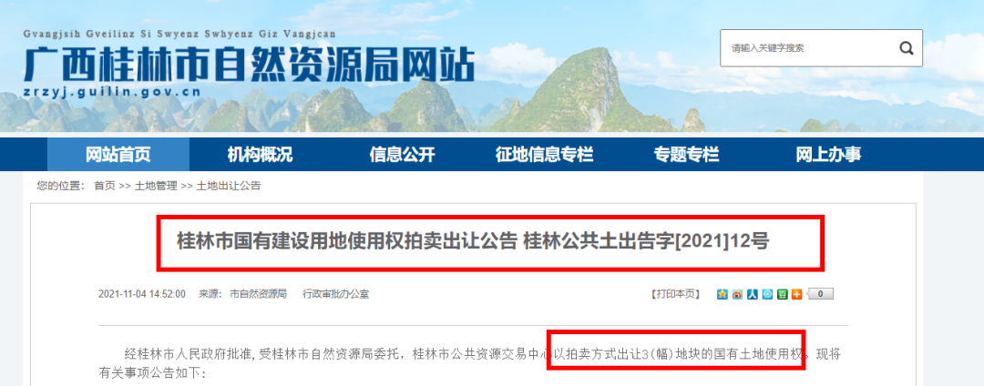 11月4日,桂林市自然资源局发布公告,以拍卖方式出让3(幅)地块的国有土地使用权。