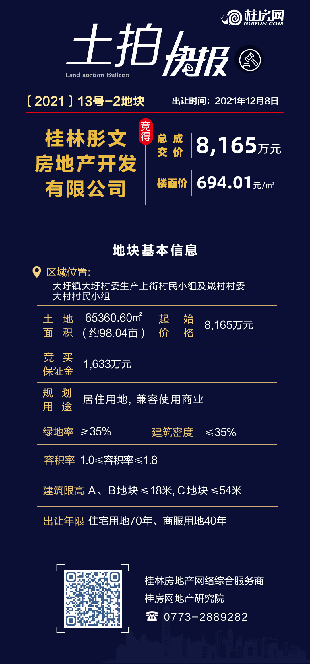 | 1.80 | 65360.60平方米 | 694.01元/㎡ | 8165.00万元 | 桂林彤文房地产开发有限公司 |