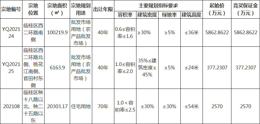 YQ202125号地块位于西二环路北侧、桃花江南侧、官田村东侧,宗地面积6163.9平方米,起始价377.2307万元。公告中明确了YQ202124、YQ202125地块的出让要求:1.竞得人须在桂林市临桂区辖区内注册法人公司开发建设。2.竞买申请人经营范围须有农产品冷链物流、仓储及销售类别。3.根据《国务院办公厅关于促进物流业健康发展政策措施的意见》(国办发〔2011〕38号)规定:土地出让后严禁擅自改变用途从事商业性房地产开发(即:农产品批发市场用地的用途和经营性质不得随意改变)。202108号地块位于秧十八路以北、秧二十五路以东,宗地面积20303.17平方米,1.0<容积率≤2.5,建筑高度≤54米,起始价2570万元,按最大容积率计算,起始楼面价约506.3元/㎡。