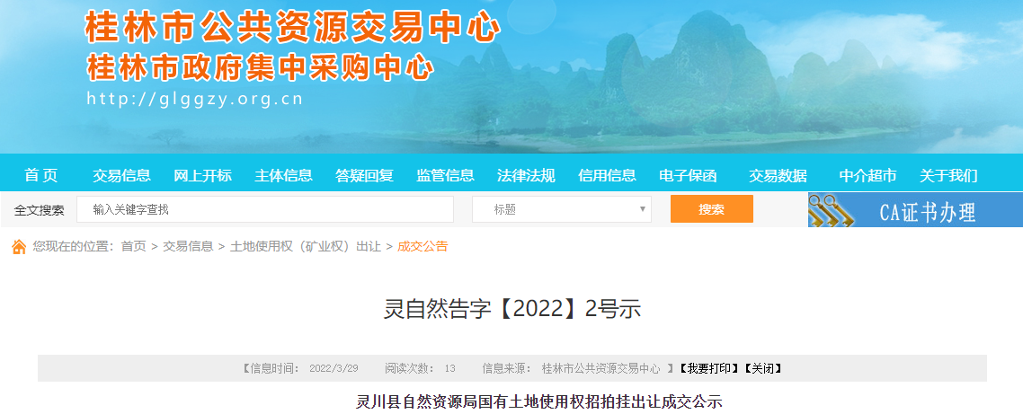 2月21日,桂林市公共资源交易中心发布一则公告,将以挂牌方式出让2宗国有建设用地使用权。