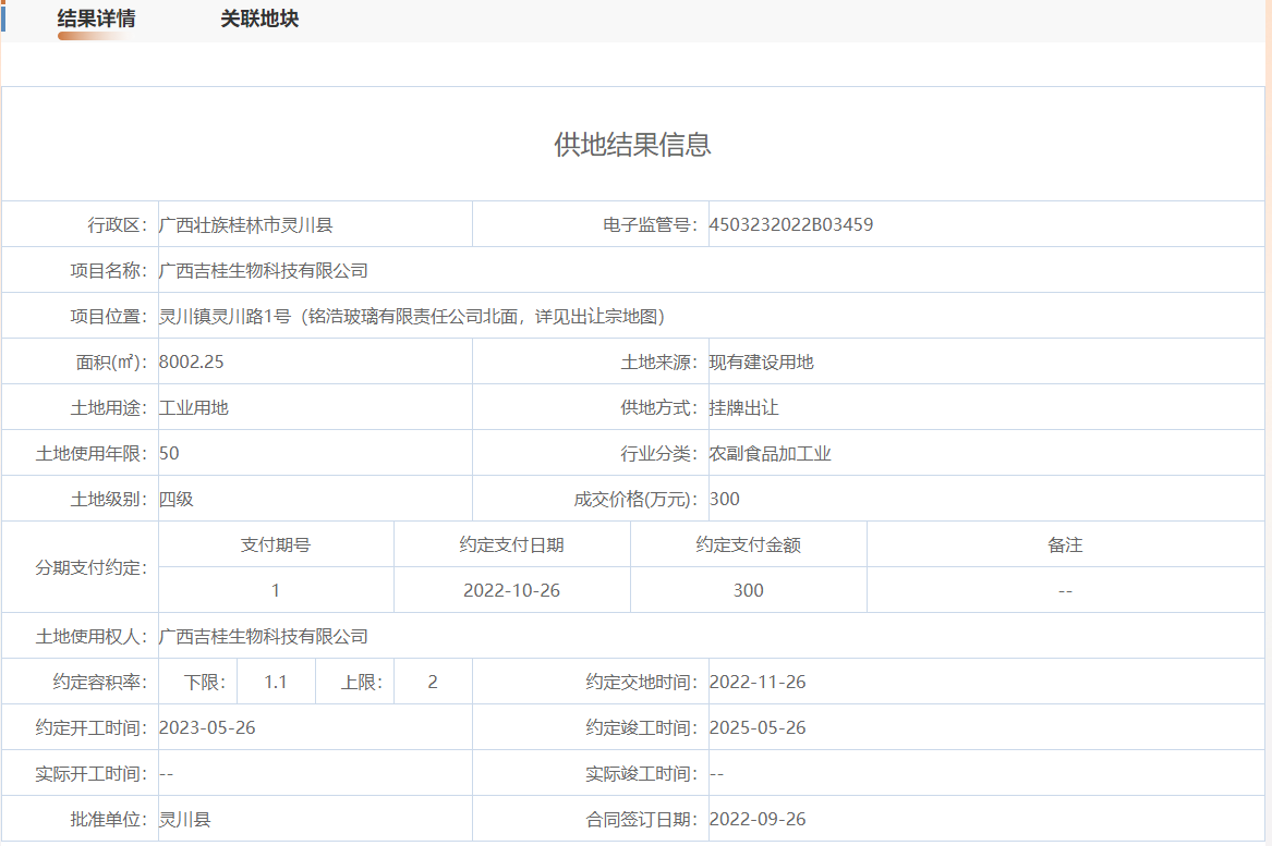 | 2.00 | 8002.25平方米 | 187.45元/㎡ | 300.00万元 | 广西吉桂生物科技有限公司 |