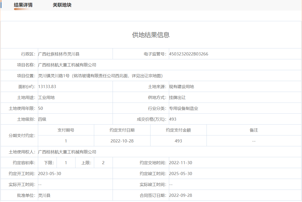 | 2.00 | 13133.83平方米 | 187.68元/㎡ | 493.00万元 | 广西桂林航大重工机械有限公司 |