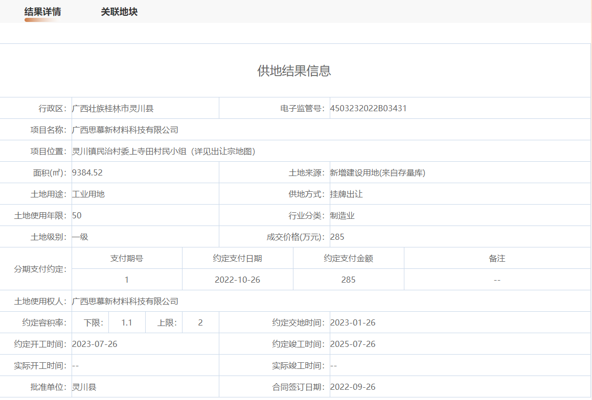 | 2.00 | 9384.52平方米 | 151.85元/㎡ | 285.00万元 | 广西思慕新材料科技有限公司 |