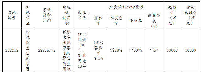 202213号宗地出让要求:1.申请人应单独竞买。2.竞得人须在桂林市临桂区辖区内注册法人公司开发建设。3.竞得人在项目开工前须办理使用林地手续,未取得林地行政许可前,项目不得开工建设。4.须按照每百户不低于20平方米的标准规划、建设婴幼儿照护服务场地,建设必备的服务设施及安全配套设施,并与住宅同步规划、同步设计、同步建设、同步验收、同步交付使用。居住区配套婴幼儿照护服务场地建成并验收合格后无偿交付当地卫生健康部门。5.按现状出让、供地。竞得人须自行负责勘验出让宗地的基础设施及配套情况(包括宗地范围内的架空线路、地下管线、地下障碍物、施工临时用电、用水、施工便道及场地平整等),并自行解决道路通行、市政设施及市政管网的接驳问题,区政府及相关部门不再投入现状标的以外的任何费用。 以上要求及其他未尽要求详见挂牌文件,以挂牌文件为准。 二、竞买人资格要求 中华人民共和国境内的法人和其他组织,除法律法规另有规定外,均可申请参加竞买。 三、竞买报名时间、地点及要求 申请人可于2022年10月9日至2022年10月17日,持有效证件资料到临桂区自然资源局四楼土地储备交易管理中心获取挂牌出让文件。提交书面申请时间:2022年10月9日至2022年10月17日。交纳竞买保证金时间的截止时间为2022年10月17日12时00分。经审查,申请人按规定交纳竞买保证金,具备申请条件的,出让人在2022年10月18日17时前确认其竞买资格。 四、挂牌时间、地点及竞价方式 本次挂牌活动在桂林市临桂区自然资源局进行,揭牌活动在桂林市公共资源交易中心12号开标室(桂林市临桂区西城中路69号创业大厦西辅楼)进行。挂牌时间为:2022年10月9日9时00分至2022年10月19日10时30分。符合条件的竞买人填写报价单报价,挂牌主持人确认该报价后,更新显示挂牌价格,挂牌主持人在挂牌公告规定的挂牌截止时间确定竞得人。 五、确定竞得人标准和方法 本次挂牌出让按照价高者得原则确定竞得人。如挂牌时间截止时,有竞买人表示愿意继续竞价,转入现场竞价,通过现场竞价确定竞得人。 六、其他 本公告未尽事宜详见挂牌文件,以本次挂牌文件为准。 七、联系方式 联系地址:桂林市临桂区自然资源局四楼 咨询电话:0773-5598621、5596336