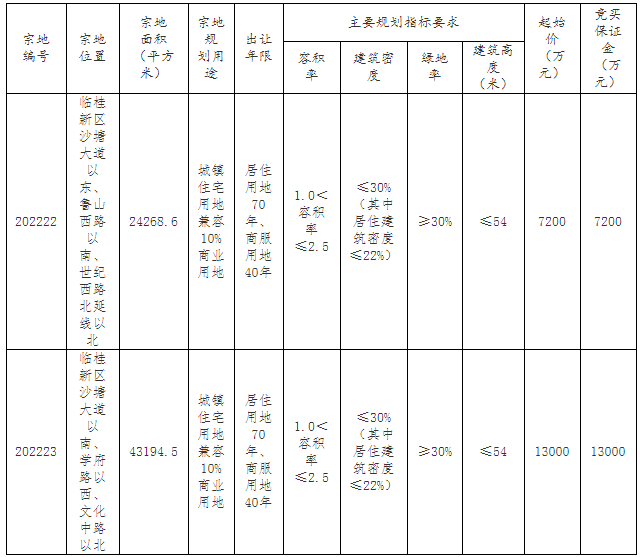 202222号宗地出让要求:1.竞得人须在临桂区内注册公司开发建设。2.申请人可单独竞买也可联合竞买。3.须按《桂林市临桂区规划管理技术规定》的要求,配置一处用地面积不低于1530平方米的3班托儿所,按同步建设、同步竣工、同步验收的要求建成后无偿移交给临桂区人民政府。4.按现状出让、供地。竞得人须自行负责勘验出让宗地的基础设施及配套情况(包括宗地范围内的架空线路、地下管线、地下障碍物、施工临时用电、用水、施工便道及场地平整等),并自行解决道路通行、市政设施及市政管网的接驳问题,区政府及相关部门不再投入现状标的以外的任何费用。 202223号宗地出让要求:1.竞得人须在临桂区内注册公司开发建设。2.申请人可单独竞买也可联合竞买。3.需按《桂林市临桂区规划管理技术规定》的要求,配置一处用地面积不低于3600平方米的6班幼儿园,按同步建设、同步竣工、同步验收的要求建成后无偿移交给临桂区人民政府。4.竞得人在项目开工前须办理使用林地手续,未取得林地行政许可前,项目不得开工建设。5.按现状出让、供地。竞得人须自行负责勘验出让宗地的基础设施及配套情况(包括宗地范围内的架空线路、地下管线、地下障碍物、施工临时用电、用水、施工便道及场地平整等),并自行解决道路通行、市政设施及市政管网的接驳问题,区政府及相关部门不再投入现状标的以外的任何费用。 以上要求及其他未尽要求详见挂牌文件,以挂牌文件为准。 二、竞买人资格要求 中华人民共和国境内的法人和其他组织,除法律法规另有规定外,均可申请参加竞买。 三、竞买报名时间、地点及要求 申请人可于2023年1月9日至2023年1月16日,持有效证件资料到临桂区自然资源局四楼土地储备交易管理中心获取挂牌出让文件。提交书面申请时间:2023年1月9日至2023年1月16日。交纳竞买保证金时间的截止时间为2023年1月17日12时00分。经审查,申请人按规定交纳竞买保证金,具备申请条件的,出让人在2023年1月17日17时前确认其竞买资格。 四、挂牌时间、地点及竞价方式 本次挂牌活动在桂林市临桂区自然资源局进行,揭牌活动在桂林市公共资源交易中心12号开标室(桂林市临桂区西城中路69号创业大厦西辅楼)进行。挂牌时间为:2023年1月9日9时00分至2023年1月18日15时30分。符合条件的竞买人填写报价单报价,挂牌主持人确认该报价后,更新显示挂牌价格,挂牌主持人在挂牌公告规定的挂牌截止时间确定竞得人。 五、确定竞得人标准和方法 本次挂牌出让按照价高者得原则确定竞得人。如挂牌时间截止时,有竞买人表示愿意继续竞价,转入现场竞价,通过现场竞价确定竞得人。 六、其他 本公告未尽事宜详见挂牌文件,以本次挂牌文件为准。 七、联系方式 联系地址:桂林市临桂区自然资源局四楼 咨询电话:0773-5598621、5596336