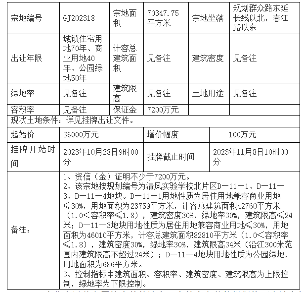 GJ202318号地块挂牌时间为2023年10月28日 9 时00分至2023年 11月8日10时00分。