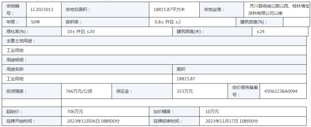 | 2023-11-17 | LC2023013 | 工业用地 | 灵川 | 灵川县绕城公路以西、桂林墙宝涂料有限公司以南 |