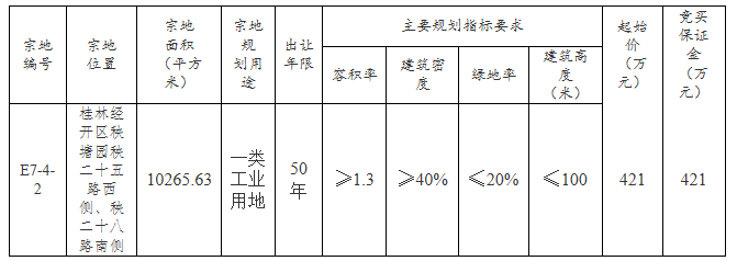 E7-4-2号宗地出让要求:1.产业用途规划为计算机、通信及其他电子设备制造业,竞买人营业执照的经营范围须包含计算机、通信及其他电子设备制造业类,方可报名参与竞买。2.投资强度≥4500万元/公顷,产出强度≥5500万元/公顷,地均税收≥195万元/公顷。3.根据《中华人民共和国环境影响评价法》的规定,项目实施前,应进行环境影响评价工作,待环境影响评价文件经生态环境部门审批后方可开工建设。4.受让人(竞得人)应自行到林业部门办理林地使用手续后,方可开工建设。5.按现状出让、供地。