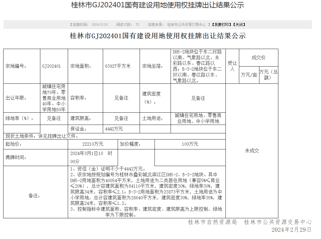 | 2024-03-01 | GJ202401 | 综合用地 | 叠彩 | DH5-2地块位于东二环路以南、气象路以北、永彩路以东、春江路以西;B-3-2地块位于东二环以南、春江路以东、气象路以北。 |