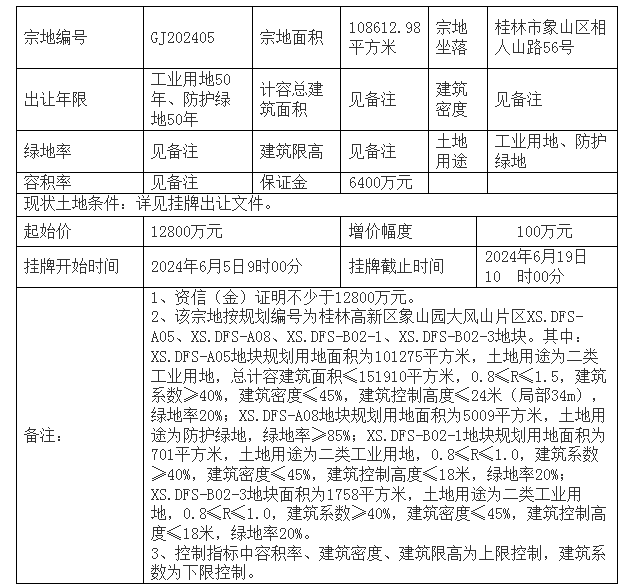 | 2024-06-19 | GJ202405 | 综合用地 | 桂林市象山区相人山路56号 |