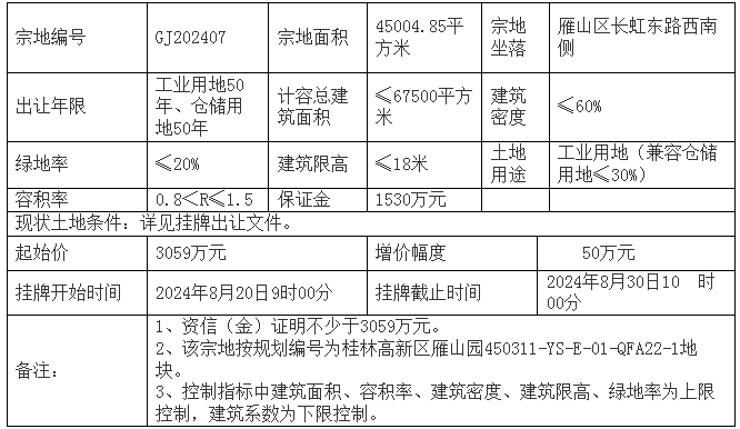 | 2024-08-30 | GJ202407 | 工业用地 | 雁山 | 雁山区长虹东路西南侧 |