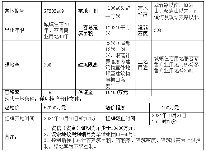 | 2024-10-21 | GJ202409 | 综合用地 | 秀峰 | 翠竹路以南,原岩山、泵岩山以东,南溪河及规划支路以北 |