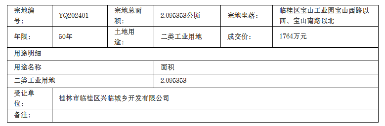 | 2024-07-31 | YQ202401 | 工业用地 | 临桂 | 临桂区宝山工业园宝山西路以西、宝山南路以北 |