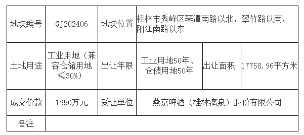 | 0.00 | 17758.96平方米 | 1950.00万元 | 燕京啤酒(桂林漓泉)股份有限公司 |