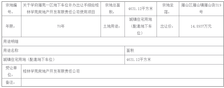 | 0.00 | 4631.12平方米 | 14.89万元 | 桂林学苑房地产开发有限责任公司 |