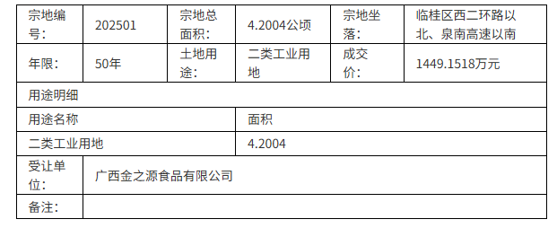 | 0.00 | 42004.00平方米 | 1449.15万元 | 广西金之源食品有限公司 |